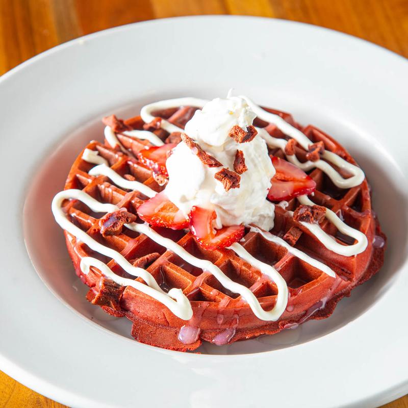 Red Velvet Belgian Waffle topped with cream cheese, vanilla drizzle, velvet crumbles, whipped cream and confectioners' sugar • *Contains: Eggs, Milk, Soy, Wheat