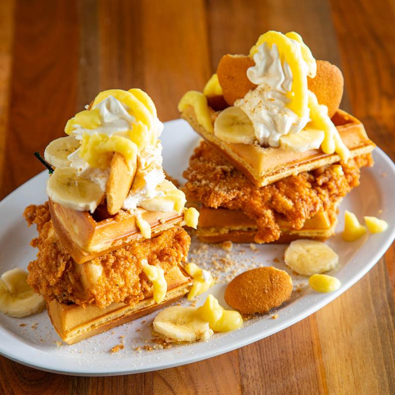 Fried chicken breast between 2 mini Belgian waffles topped with confectioners' sugar • *Contains: Eggs, Milk, Soy, Wheat | *Prepared in peanut oil