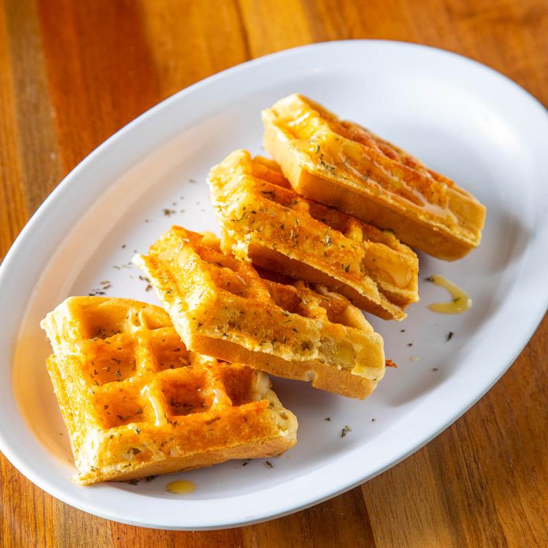 Scrambled eggs, cheese and your choice of sausage, bacon, ham or turkey in a Belgian waffle.