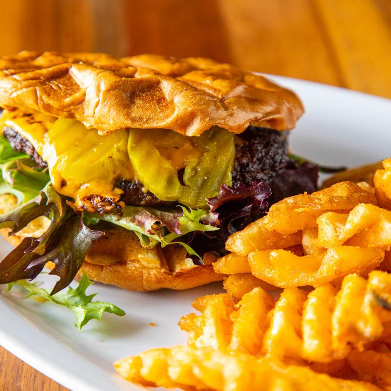 Crispy chicken breast topped with egg of your choice (scrambled, over easy, over hard, over medium or sunny side up) and American cheese between two mini waffles • *Contains: Eggs, Milk, Soy, Wheat | *Prepared in peanut oil
