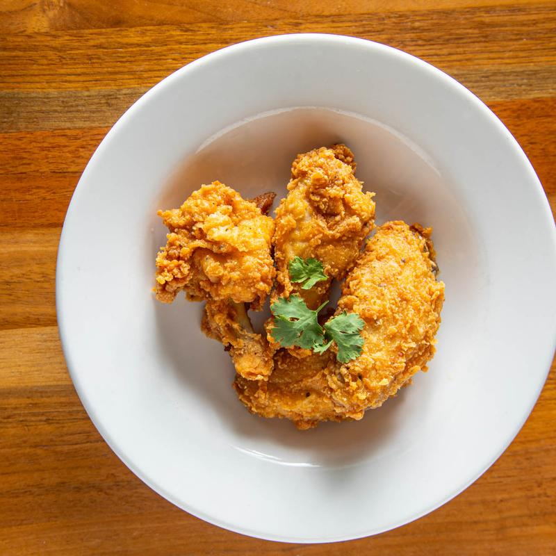 Crispy chicken breast topped with egg of your choice (scrambled, over easy, over hard, over medium or sunny side up) and american cheese between two mini waffles • *Contains: Eggs, Milk, Soy, Wheat | *Prepared in peanut oil