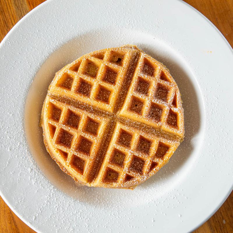 Beglian Waffle topped with confectioners' sugar and butter • *Contains: Eggs, Milk, Soy, Wheat